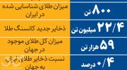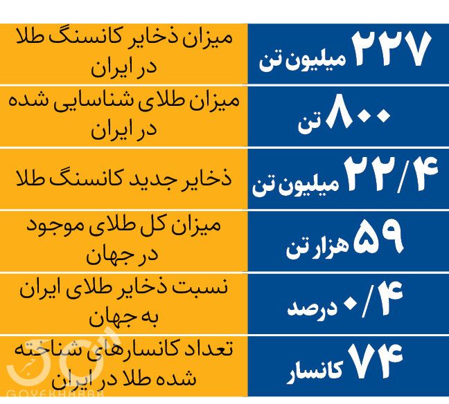 تا پایان سال ۱۴۰۲ ذخایر طلای کشف شده در ایران شامل ۲۲۷ میلیون تن کانسنگ و ۲۶۹ تن طلای محتوای قطعی باقیمانده است که البته بهنظر میرسد پتانسیلهای بیشتری از ذخایر طلا در کشور نهفته باشد.