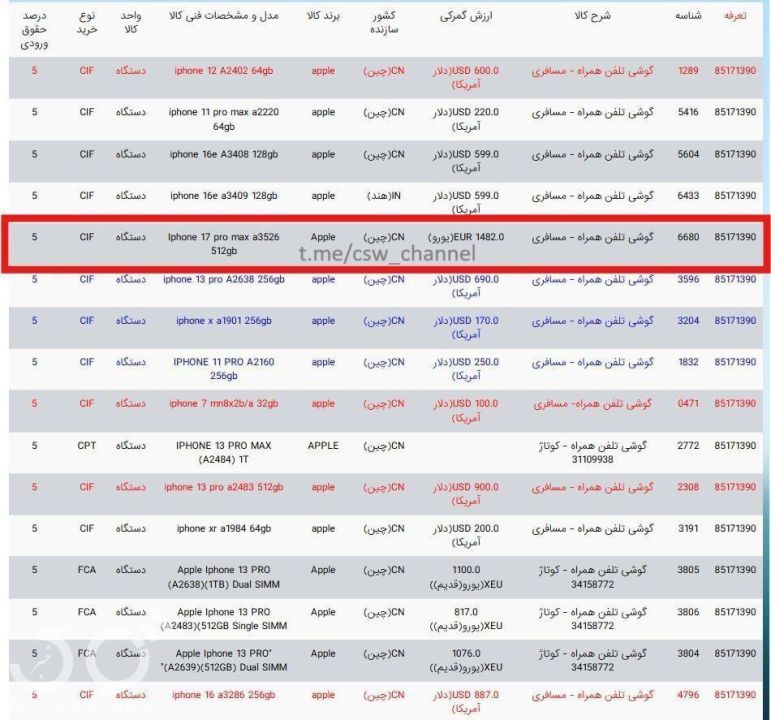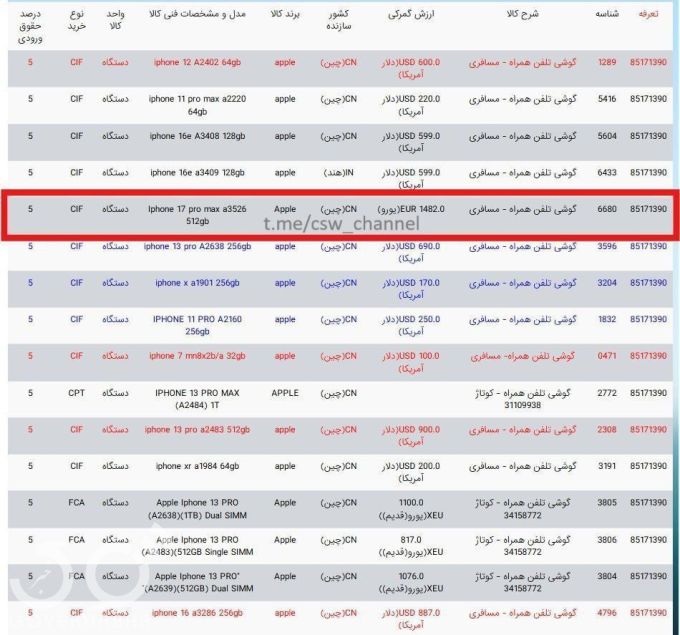 طبق لیست ارزشگذاری گمرکی TSC سامانه پنجره واحد تجارت فرامرزی، اولین آیفون ۱۷ با مشخصات Iphone ۱۷ pro max a۳۵۲۶ ۵۱۲gb جهت اظهار مسافری در فرآیند رجیستری در سامانه گمرک قرار گرفت.