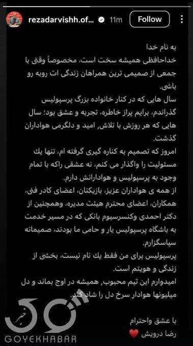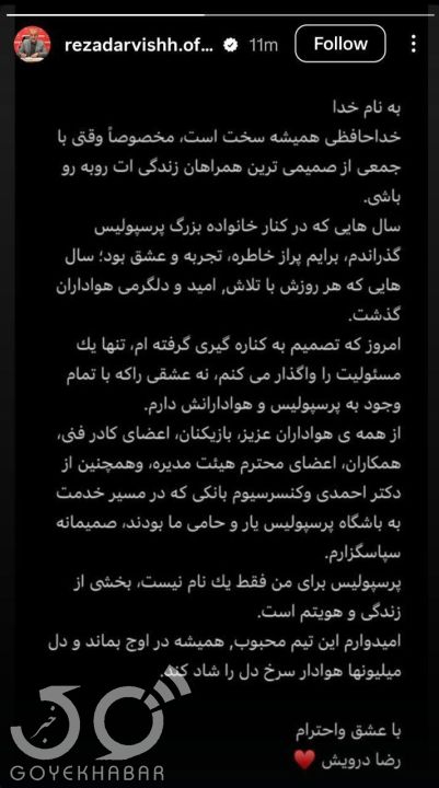 رضا درویش ساعتی بعد از استعفا از مدیرعاملی باشگاه پرسپولیس با انتشار یک استوری نوشت:خداحافظی همیشه سخت است، مخصوصاً وقتی با جمعی از صمیمی‌ترین همراهان زندگی‌ات روبه‌رو باشی.