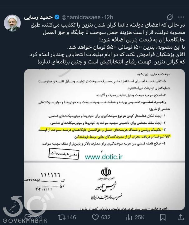 حمید رسایی، نماینده مجلس در توییتر خود نوشت: در حالی که اعضای دولت، دائما گرانشدن بنزین را تکذیب میکنند، طبق مصوبه دولت قرار است هزینه حمل سوخت تا جایگاه و حقالعمل جایگاهداران به قیمت بنزین اضافه شود!با این مصوبه، بنزین ۱۵۰۰ تومانی ۵۵۰۰ تومان خواهد شد.