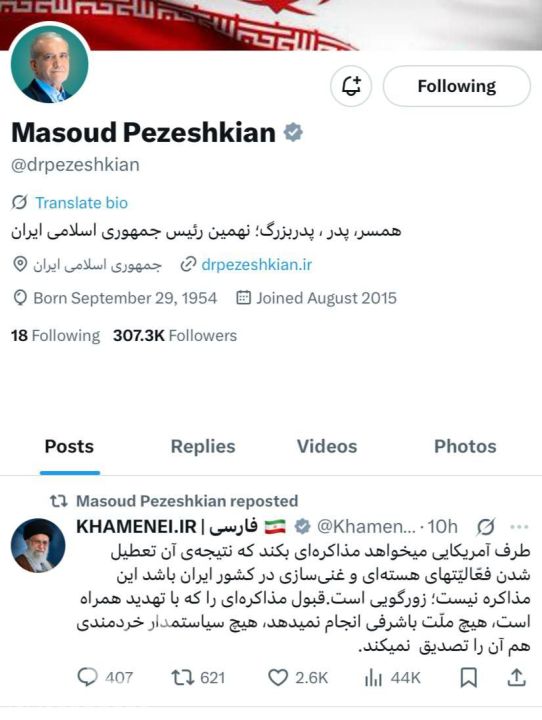 مسعود پزشکیان رئیس جمهور ایران توئیت رهبر انقلاب درباره مذاکره با آمریکا را بازنشر کرد.