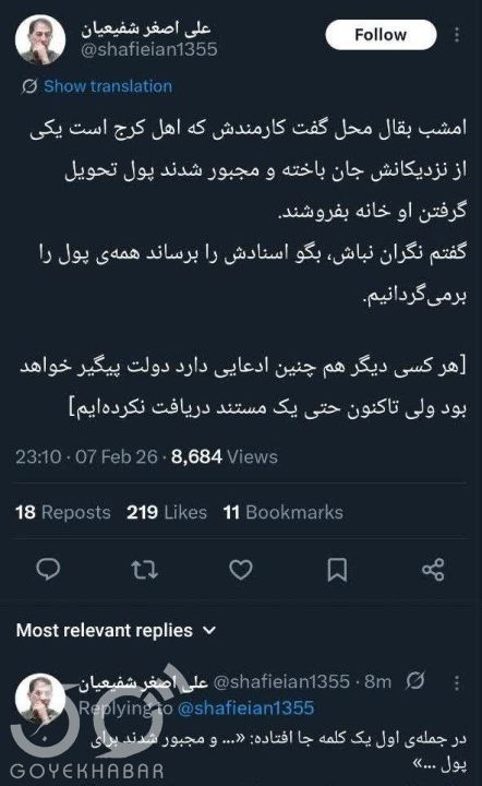علی اصغر شفیعیان، چهره رسانهای نزدیک به دولت در شبکه اجتماعی ایکس نوشت:امشب بقال محل گفت کارمندش که اهل کرج است یکی از نزدیکانش جان باخته و مجبور شدند پول تحویل گرفتن او خانه بفروشند.گفتم نگران نباش، بگو اسنادش را برساند همهی پول را برمیگردانیم.[هر کسی دیگر هم چنین ادعایی دارد دولت پیگیر خواهد بود ولی تاکنون حتی یک مستند دریافت نکردهایم]